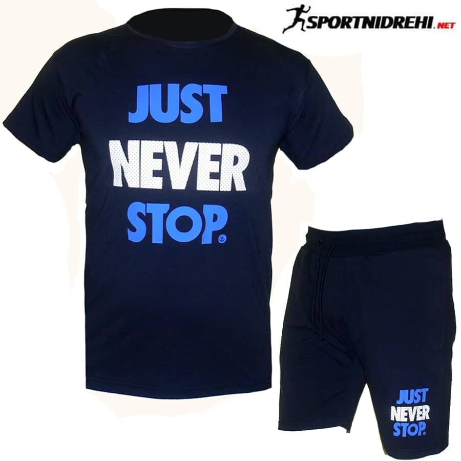 Летен спортен екип NEVER STOP, тъмносин, памук и ликра. Екипа е съставен от тениска и къси панталони. Късите панталони имат два джоба отпред с ципове и един отзад без цип. Високо качество на материя и изработка.