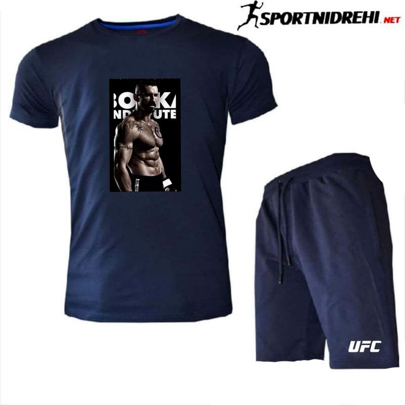 Летен спортен екип UFC YURI BOYKA, тъмносин, памук и ликра. Екипа е съставен от тениска и къси панталони. Късите панталони имат два джоба отпред с ципове. Високо качество на материя и изработка.