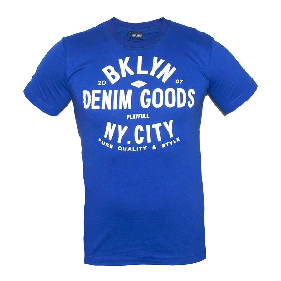 Мъжка тениска PLAYFUL, 100 % памук, синя. Произведено в България. Щампата е гумирана. Високо качество на материя и изработка.