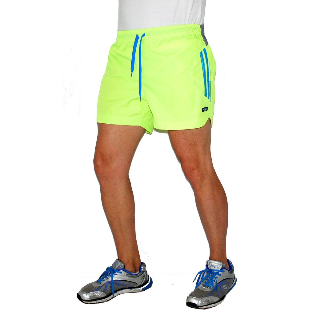 Мъжки бански RAYMOND, електриково зелени със синьо, полиестер. Произведено в България. Материята е бързосъхнещ полиестер. Банските имат мрежест бандаж, връзки за стягане и 2 джоба отпред и 1 отзад. Високо качество на материя и изработка.
