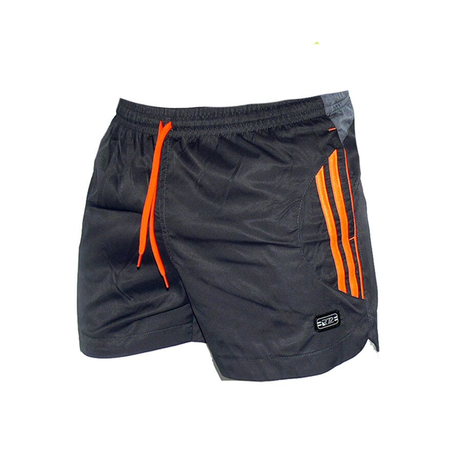 Мъжки бански RAYMOND, графит с оранжево, полиестер. Произведено в България. Материята е бързосъхнещ полиестер. Банските имат мрежест бандаж, връзки за стягане, 2 джоба отпред с ципове. Високо качество на материя и изработка.