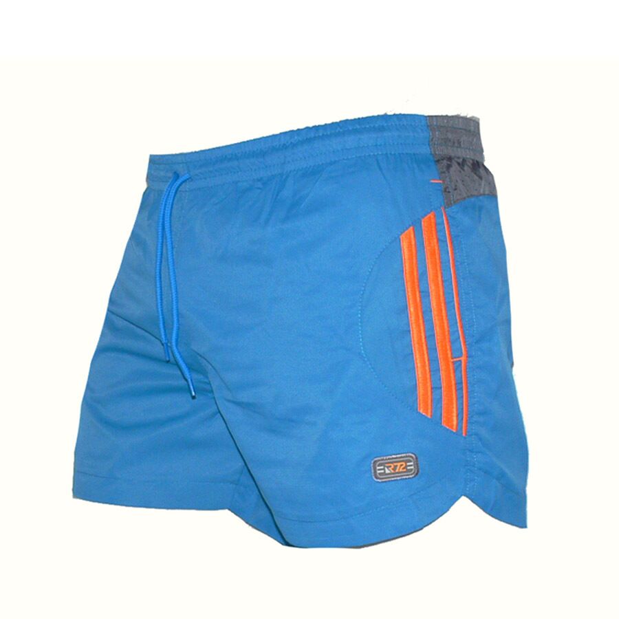 Мъжки бански RAYMOND, петролено сини с оранжево, полиестер. Произведено в България. Материята е бързосъхнещ полиестер. Банските имат мрежест бандаж, връзки за стягане, 2 джоба отпред и 1 отзад всичките с ципове. Високо качество на материя и изработка.