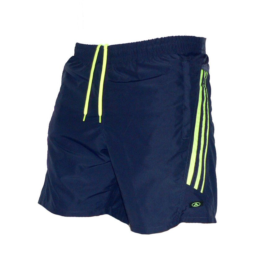 Мъжки бански RAYMOND, тъмно сини с електриково зелено, полиестер. Произведено в България. Материята е бързосъхнещ полиестер. Спортните панталони имат мрежест бандаж, връзки за стягане и 2 джоба отпред с ципове. Високо качество на материя и изработка.