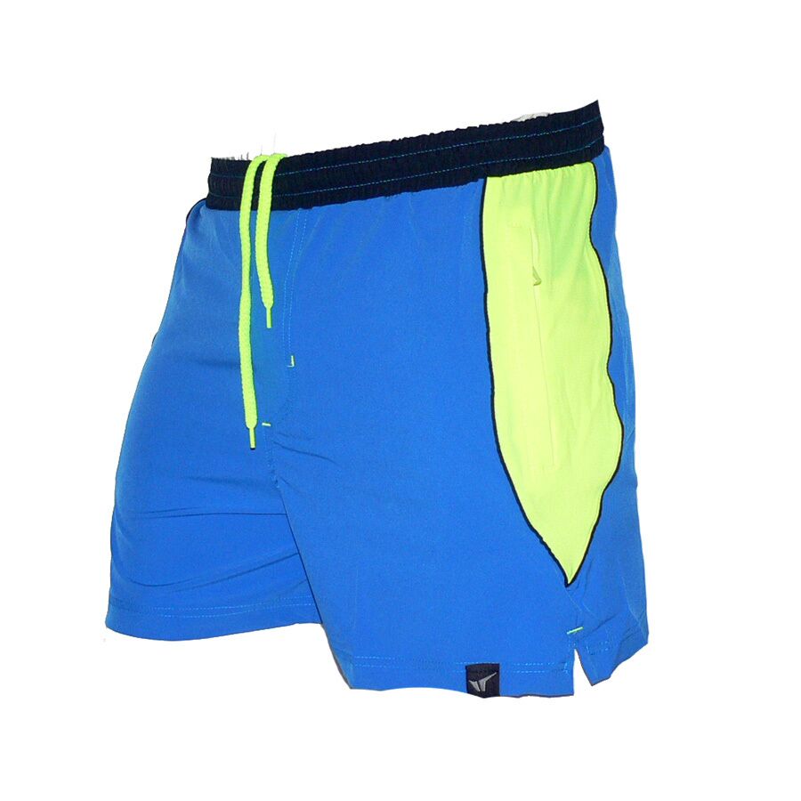 Мъжки бански REDICS, сини с електриково зелено, полиестер. Произведено в България. Материята е бързосъхнещ полиестер. Имат мрежест бандаж, връзки за стягане и 2 джоба отпред с ципове. Високо качество на материя и изработка.