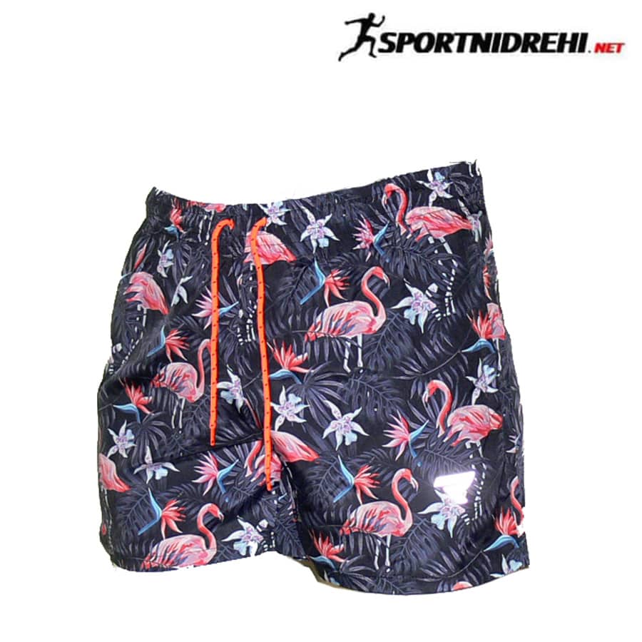 Мъжки бански REPTIL, розово фламинго, полиестер. Произведено в България. Материята е бързосъхнещ полиестер. Банските имат 2 джоба отпред с ципове, мрежест бандаж и връзки за стягане.