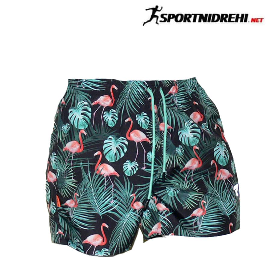 Мъжки бански  REPTIL, розово фламинго, полиестер.  Произведено в България. Материята е бързосъхнещ полиестер. Банските имат 2 джоба отпред с ципове, мрежест бандаж и връзки за стягане.