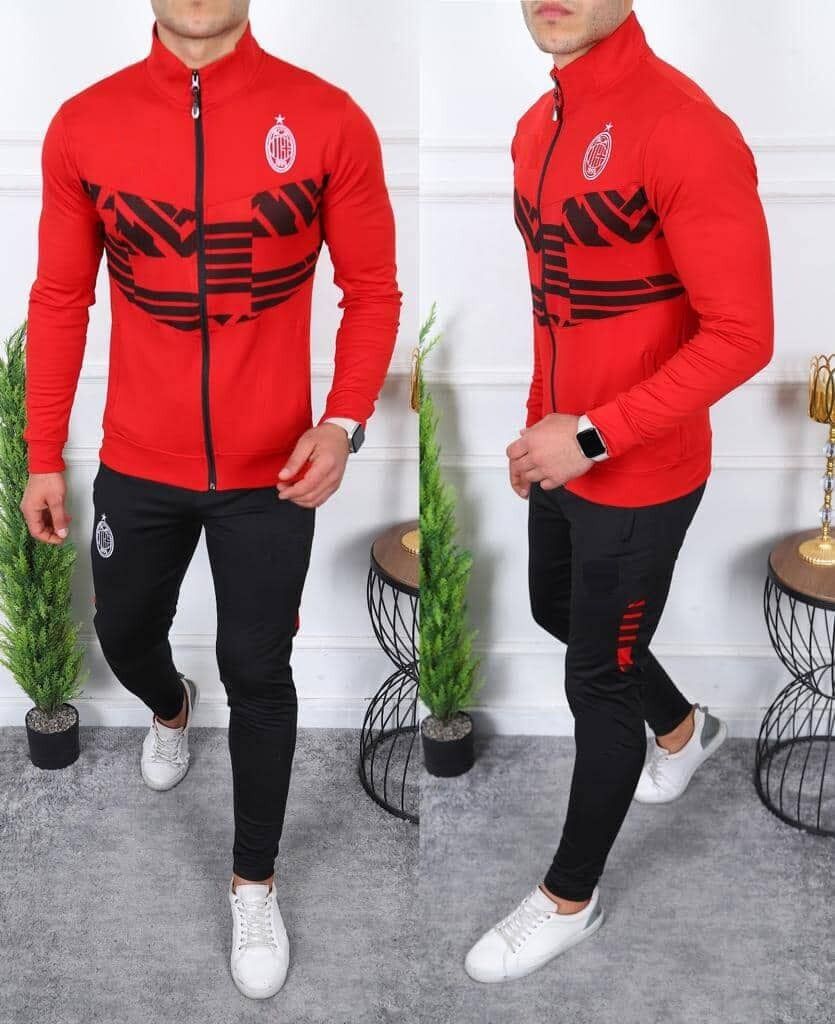 Мъжки футболен екип FC ACM, червено и черно, полиестер. Емблемите са везани. Страхотен модел анцуг от дишаща материя, подходящ за сезона пролет-есен. Горнището има 2 джоба, долнището също има 2 джоба. Всички джобове са със ципове. Долнището е стеснено долу на крачола, но няма ластик.