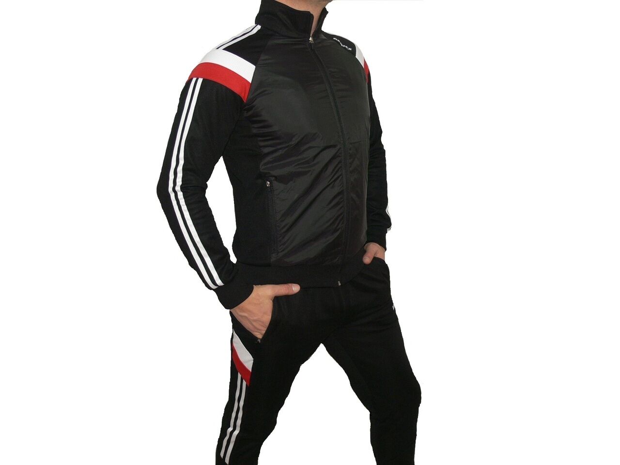 Мъжки футболен екип REDICS, черен със червено и бяло, полиестер. Произведено в България. Горнището има 2 джоба, долнището също 2 джоба. Всички джобове са със ципове. Долнището е стеснено долу на крачола и има цип. Високо качество на материя и изработка.