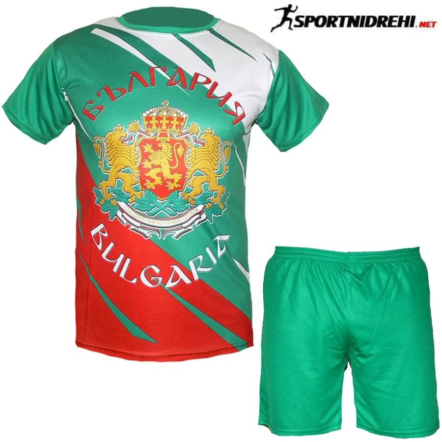 Мъжки летен екип БЪЛГАРИЯ, бяло, зелено, червено, полиестер. Страхотен екип от дишаща материя, подходящ за летния сезон. Екипа се състои от тениска и шорти. Шортите са без джобове.