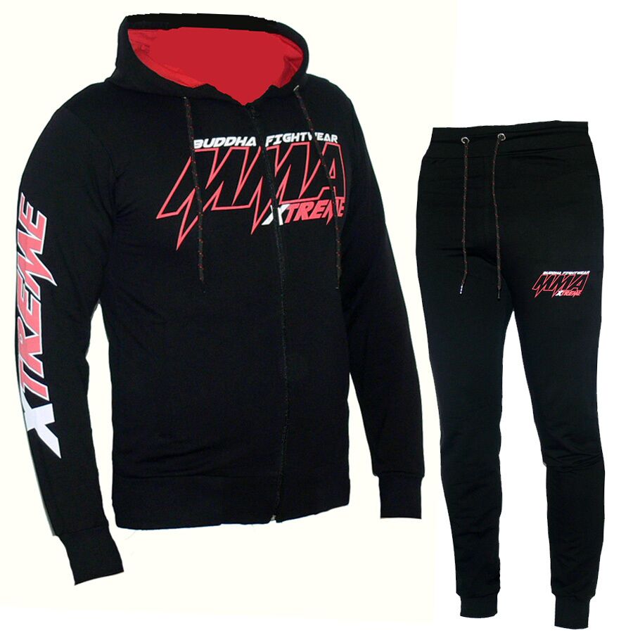 Мъжки спортен екип MMA XTREME, черен с червено, памук и ликра. Горнището има 2 джоба, долнището също има 2 джоба. Всички джобове са със ципове. Горнището има качулка. Долнището е стеснено долу на крачола с широк ластик.