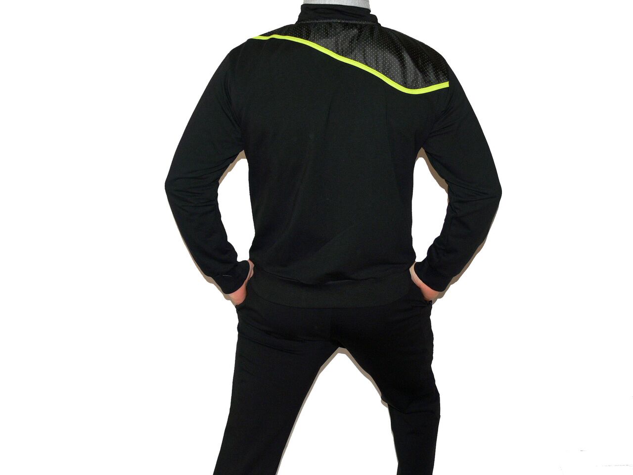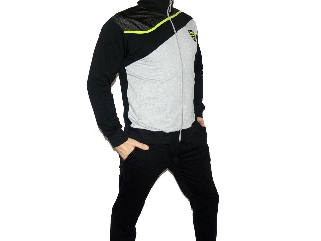 Мъжки спортен екип QUICK 2, черен със сиво и електриково зелено, памук и ликра. Произведено в България. Горнището има 2 джоба, долнището също 2 джоба. Всички джобове са със ципове. Долнището е прав модел. Високо качество на материя и изработка.
