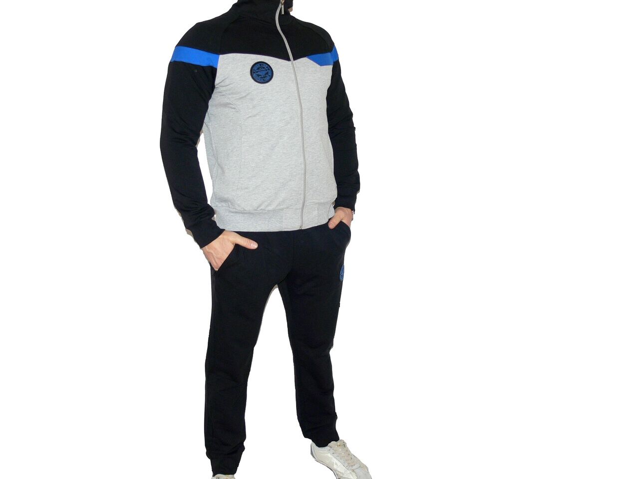 Мъжки спортен екип QUICK, черен със сиво и синьо, памук и ликра. Произведено в България. Горнището има 2 джоба, долнището също 2 джоба. Всички джобове са със ципове. Долнището е стеснено долу на крачола. Високо качество на материя и изработка.