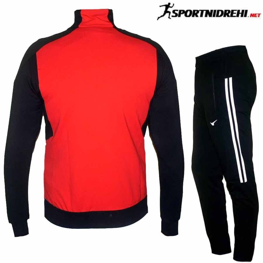 Мъжки спортен екип REDICS 230005, черен с червено, памук и ликра. Произведено в България. Материята е 77% памук, 17% полиестер и 6% еластан. Горнището има 2 джоба, долнището също има 2 джоба. Всички джобове са със ципове. Долнището е стеснено долу на крачола, но няма цип. Високо качество на материя и изработка.
