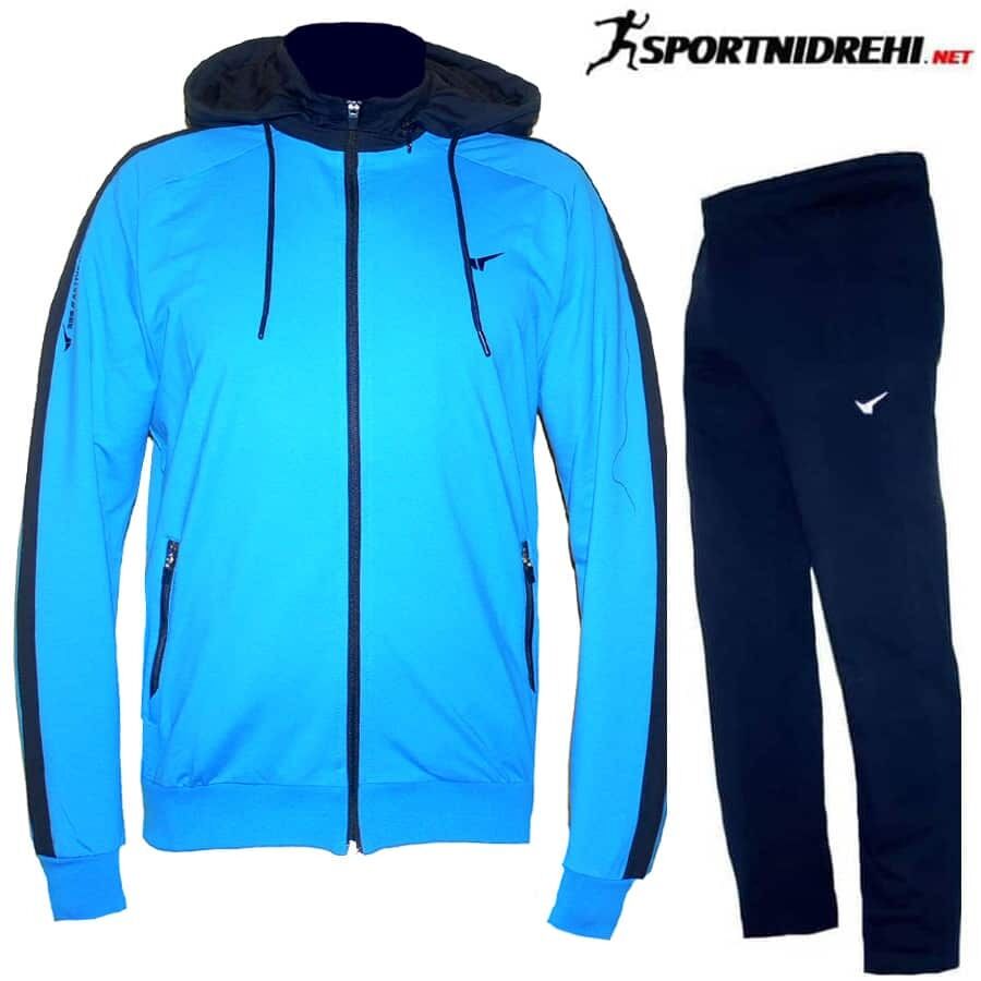 Мъжки спортен екип REDICS 230085, тъмносин със синьо, памук и ликра. Произведено в България. Материята е 77% памук, 17% полиестер и 6% еластан. Екипа е със сваляща се на цип качулка. Горнището има 2 джоба, долнището също има 2 джоба. Всички джобове са със ципове. Долнището е с прав крачол. Високо качество на материя и изработка.