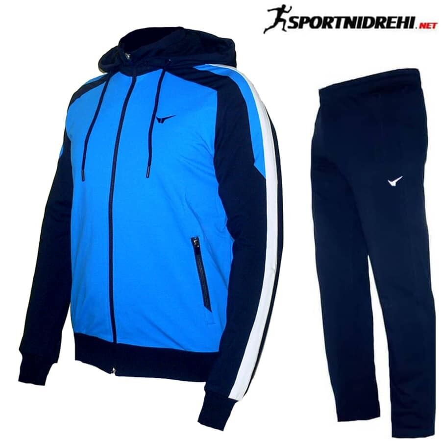 Мъжки спортен екип REDICS 230085, тъмносин със синьо, памук и ликра. Произведено в България. Материята е 77% памук, 17% полиестер и 6% еластан. Екипа е със сваляща се на цип качулка. Горнището има 2 джоба, долнището също има 2 джоба. Всички джобове са със ципове. Долнището е с прав крачол. Високо качество на материя и изработка.