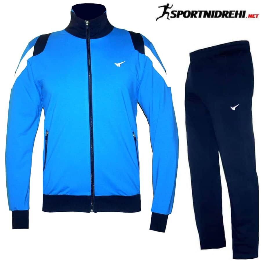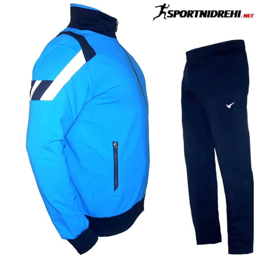 Мъжки спортен екип REDICS 230114, тъмносиньо със синьо, памук и ликра. Произведено в България. Материята е 77% памук, 17% полиестер и 6% еластан. Горнището има 2 джоба, долнището също има 2 джоба. Всички джобове са с ципове. Долнището е с прав крачол. Високо качество на материя и изработка.