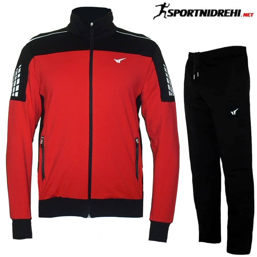 Мъжки спортен екип REDICS 230122, черен с червено, памук и ликра. Произведено в България. Материята е 77% памук, 17% полиестер и 6% еластан. Горнището има 2 джоба, долнището също има 2 джоба. Всички джобове са със ципове. Долнището е с прав крачол. Високо качество на материя и изработка.