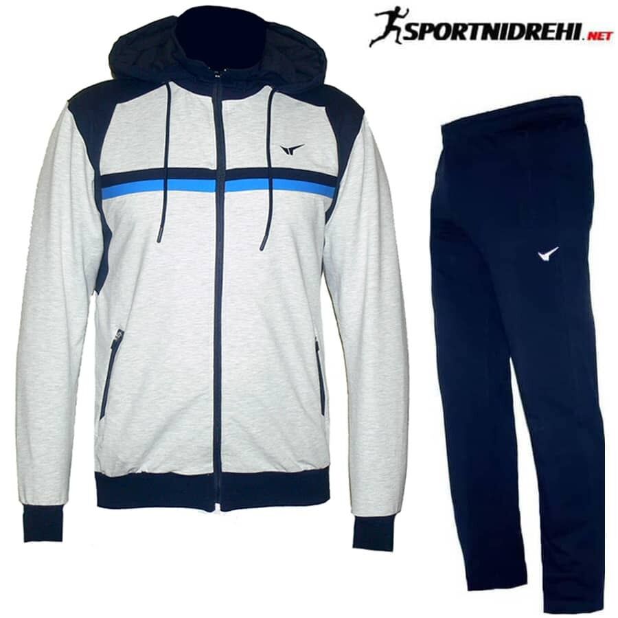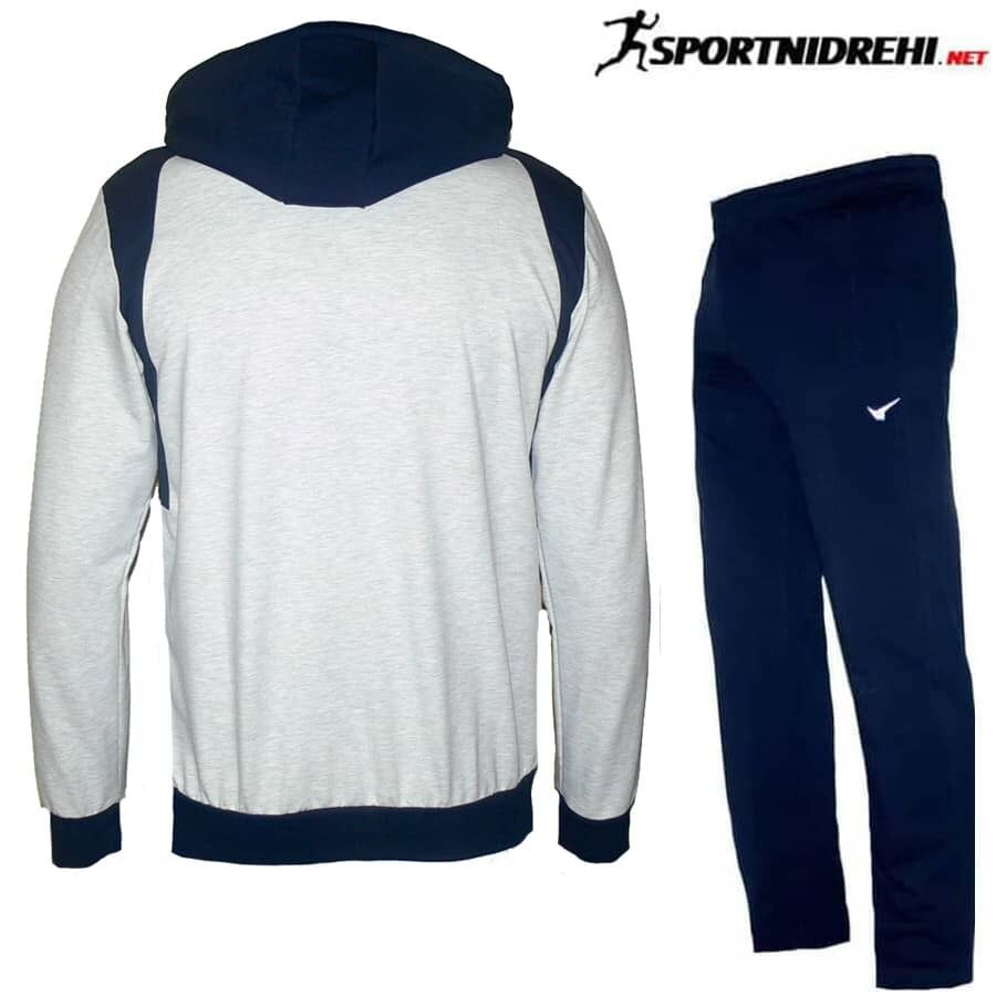 Мъжки спортен екип REDICS 230189, тъмносиньо със сиво и синьо, памук и ликра. Произведено в България. Материята е 77% памук, 17% полиестер и 6% еластан. Горнището има 2 джоба, долнището също има 2 джоба. Всички джобове са с ципове. Долнището е стеснено долу на крачола, но няма цип или ластик. Високо качество на материя и изработка.