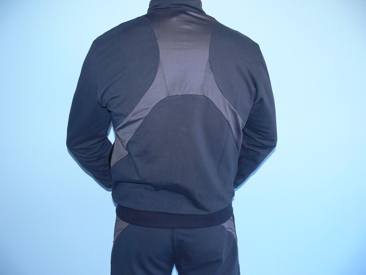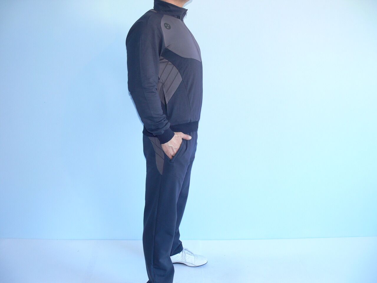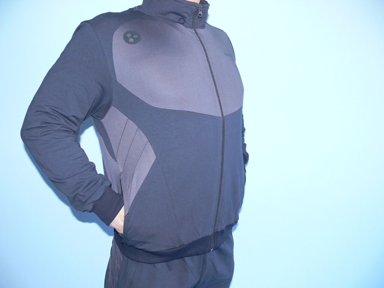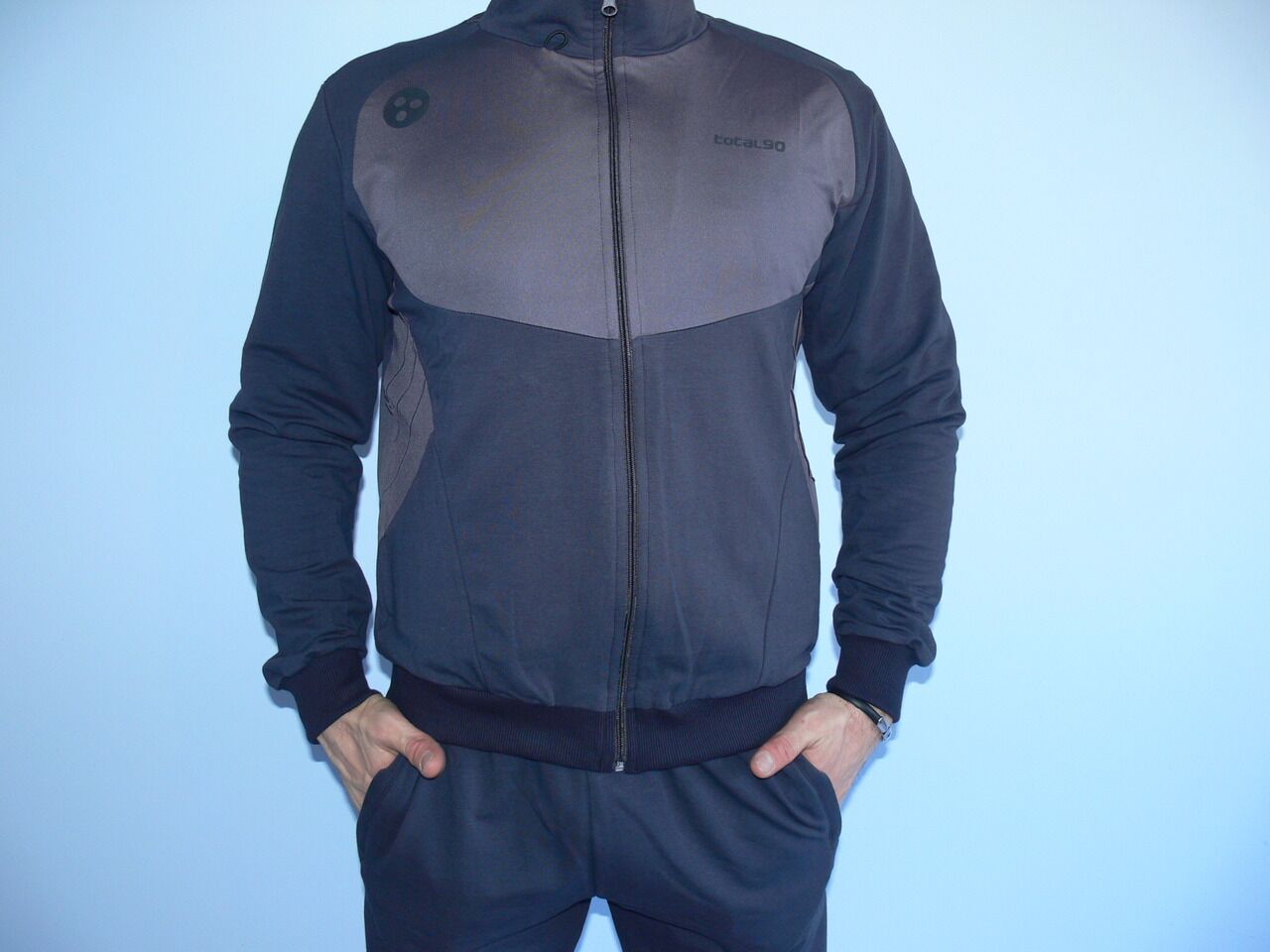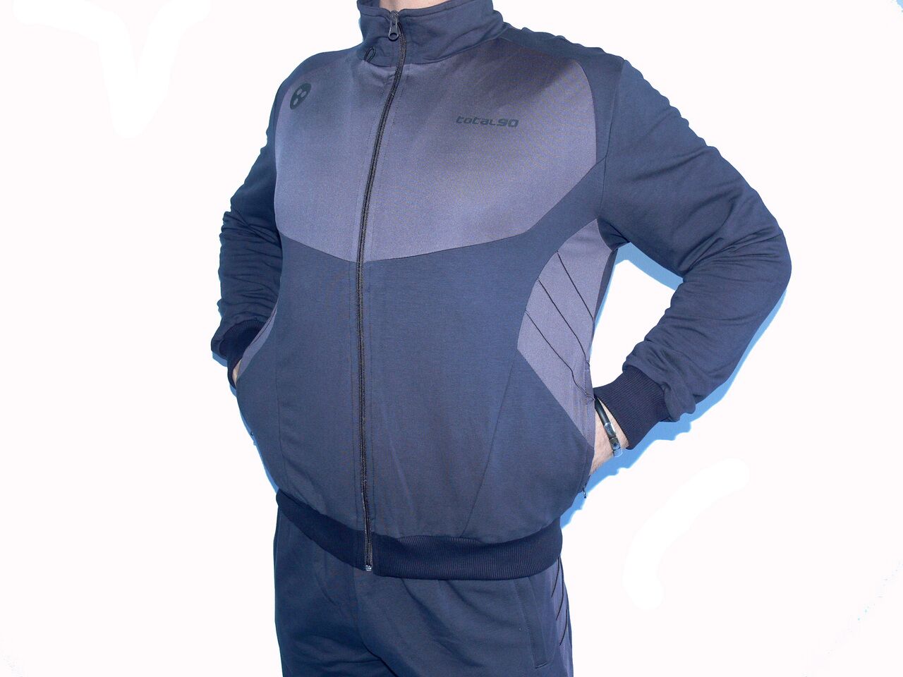 Мъжки спортен екип TOTAL 90, графит, памук, полиестер и ликра. Произведено в България. Горнището има 2 джоба, долнището също има 2 джоба. Всички джобове са със ципове. Високо качество на материя и изработка.