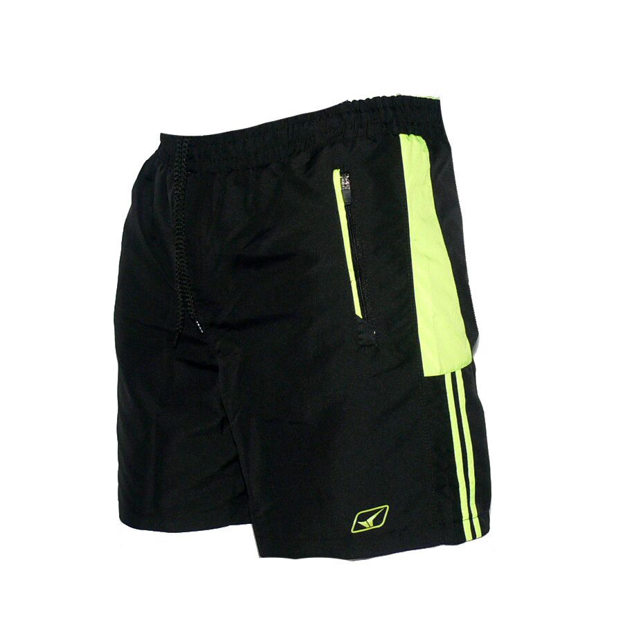 Мъжки спортни шорти REDICS, черни с електриково зелено, полиестер. Произведено в България. Материята е бързосъхнещ полиестер. Шортите имат мрежест бандаж, връзки за стягане и 2 джоба отпред с ципове. Високо качество на материя и изработка.