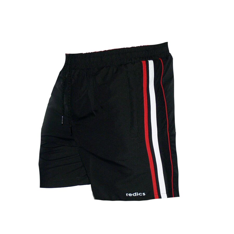 Мъжки спортни шорти REDICS, черни с червено, полиестер. Произведено в България. Материята е бързосъхнещ полиестер. Шортите имат мрежест бандаж, връзки за стягане и 2 джоба отпред с ципове. Високо качество на материя и изработка.