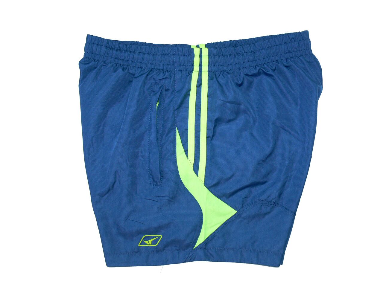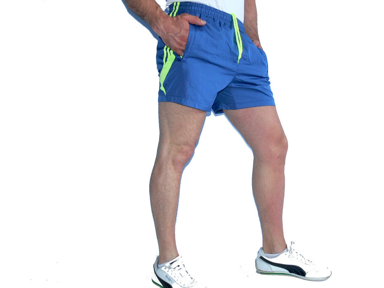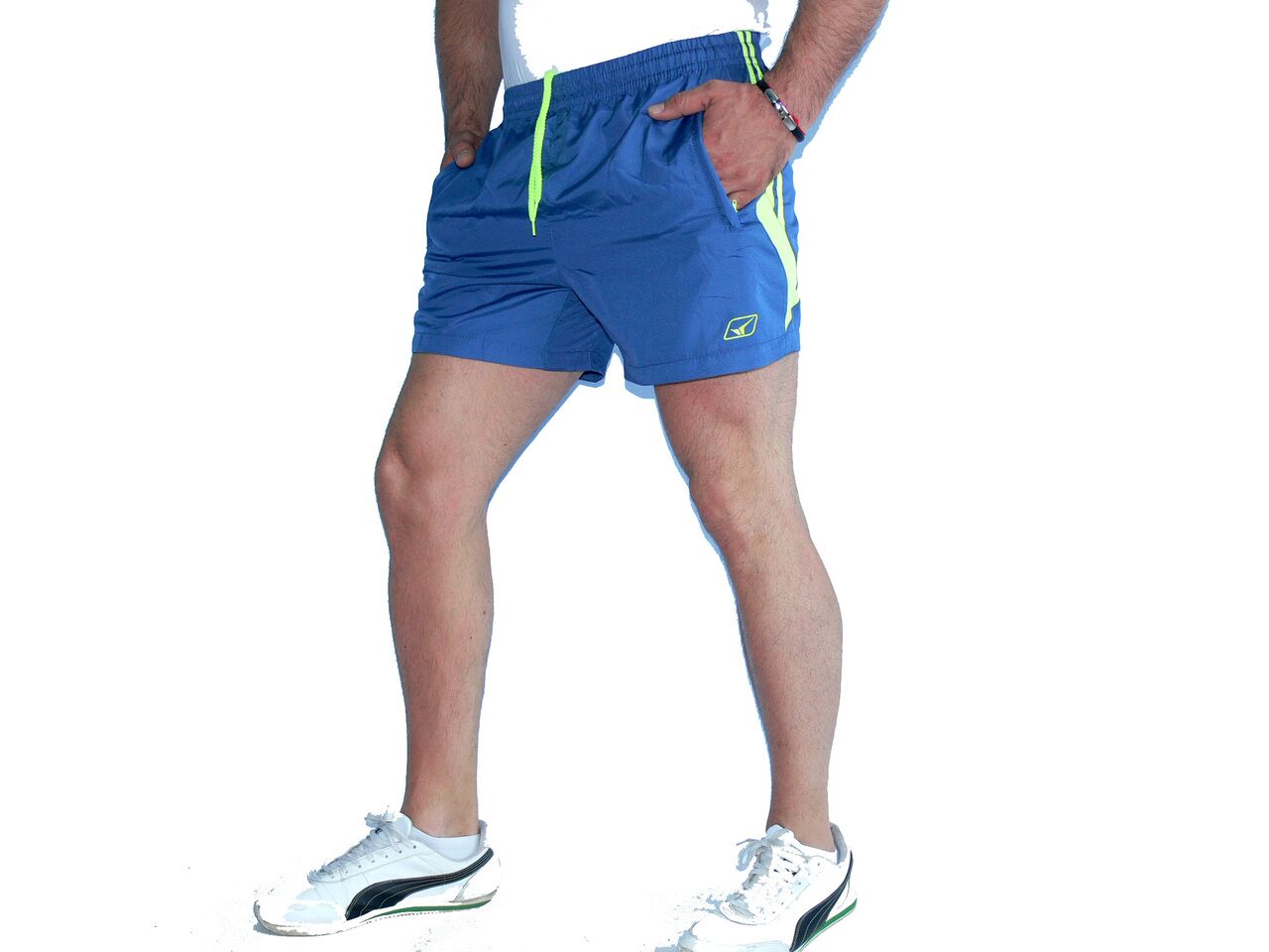 Мъжки спортни шорти REDICS, сини с електриково зелено, полиестер. Произведено в България. Материята е бързосъхнещ полиестер. Спортните панталони имат мрежест бандаж, връзки за стягане и 2 джоба отпред с ципове. Високо качество на материя и изработка.