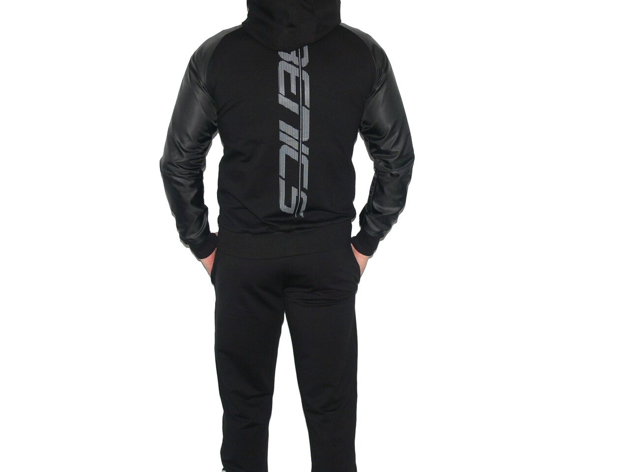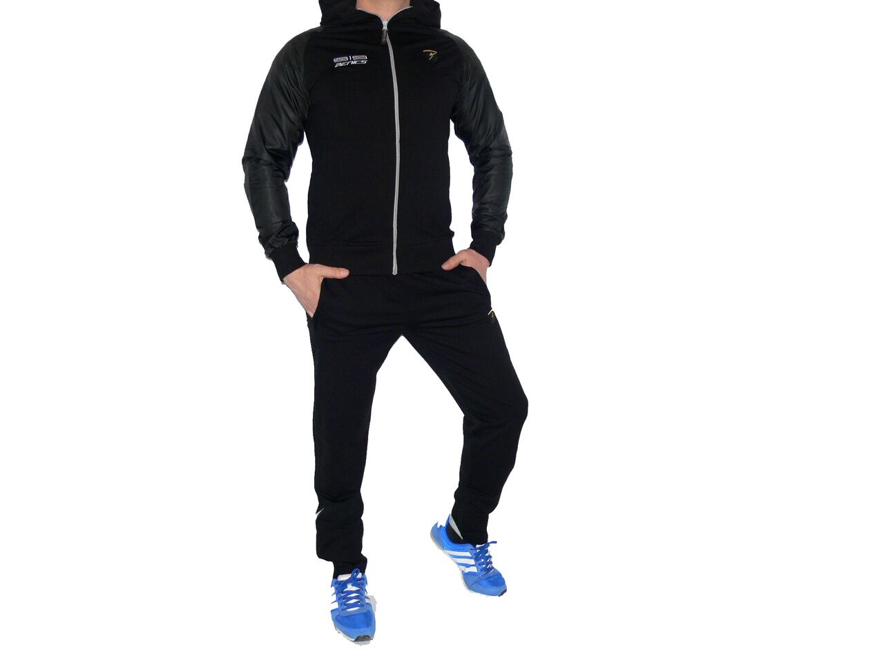 Спортен екип BENICS, черен, памук, ликра и полиестер. Произведено в България. Горнището има 2 джоба, долнището също има 2 джоба. Всички джобове са със ципове. Долнището е стеснено долу на крачола и има цип. Горнището има качулка.