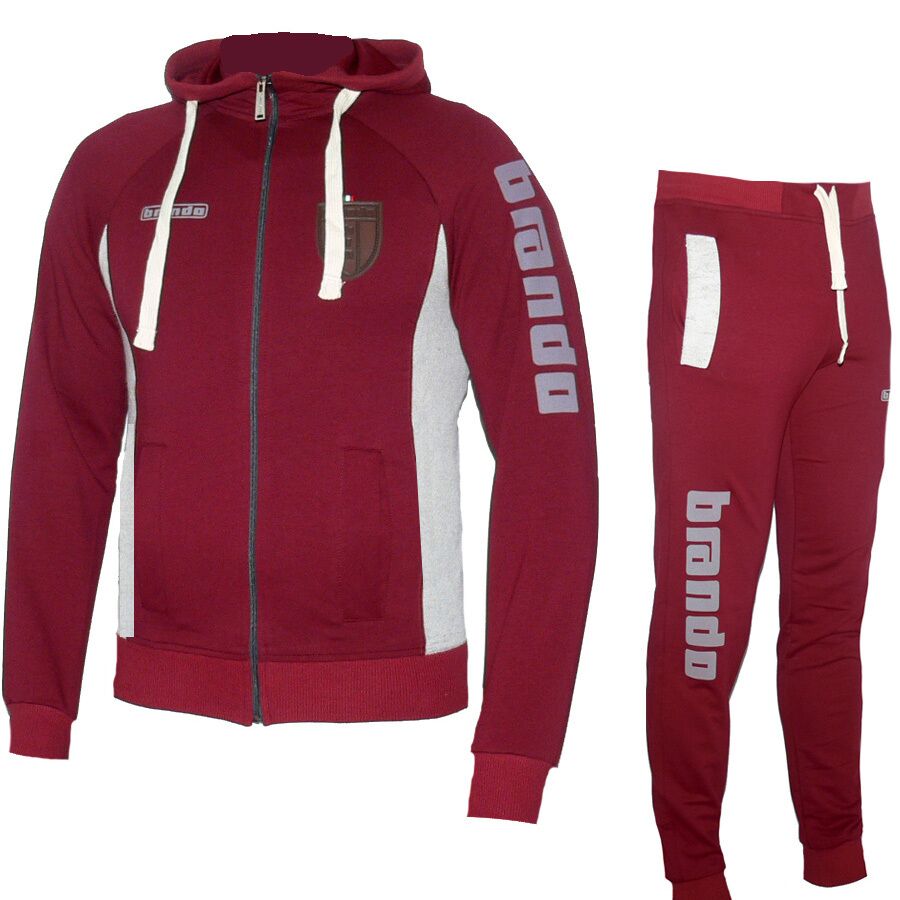Спортен екип BRANDO, бордо, памук и ликра, с качулка. Произведено в България. Горнището има 2 джоба, долнището има 2 джоба отпред и 1 отзад. Джобовете са без ципове. Долнището е стеснено долу на крачола с широк ластик. Горнището има качулка. Високо качество на материя и изработка.