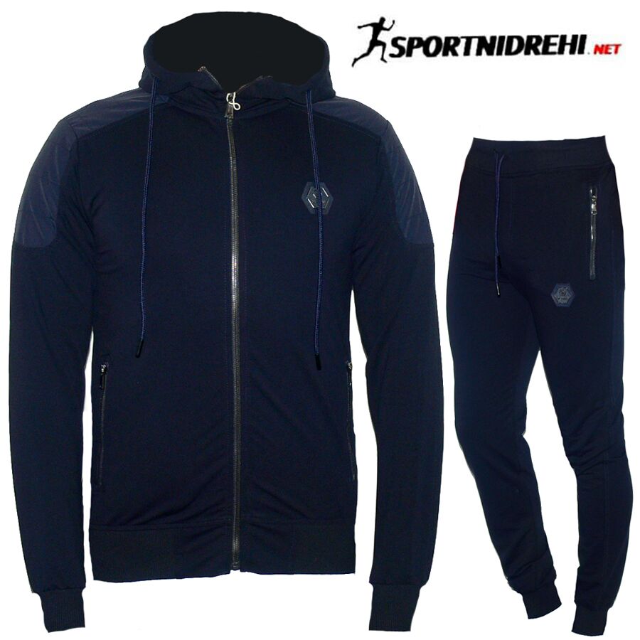 Спортен екип BRANDO, тъмносин, памук и ликра, с качулка. Произведено в България. Горнището има 2 джоба с ципове, долнището също има 2 джоба отпред с ципове и 1 отзад без цип. Всички ципове са метални. Горнището има качулка. Долнището е стеснено долу на крачола и има широк ластик. Високо качество на материя и изработка.