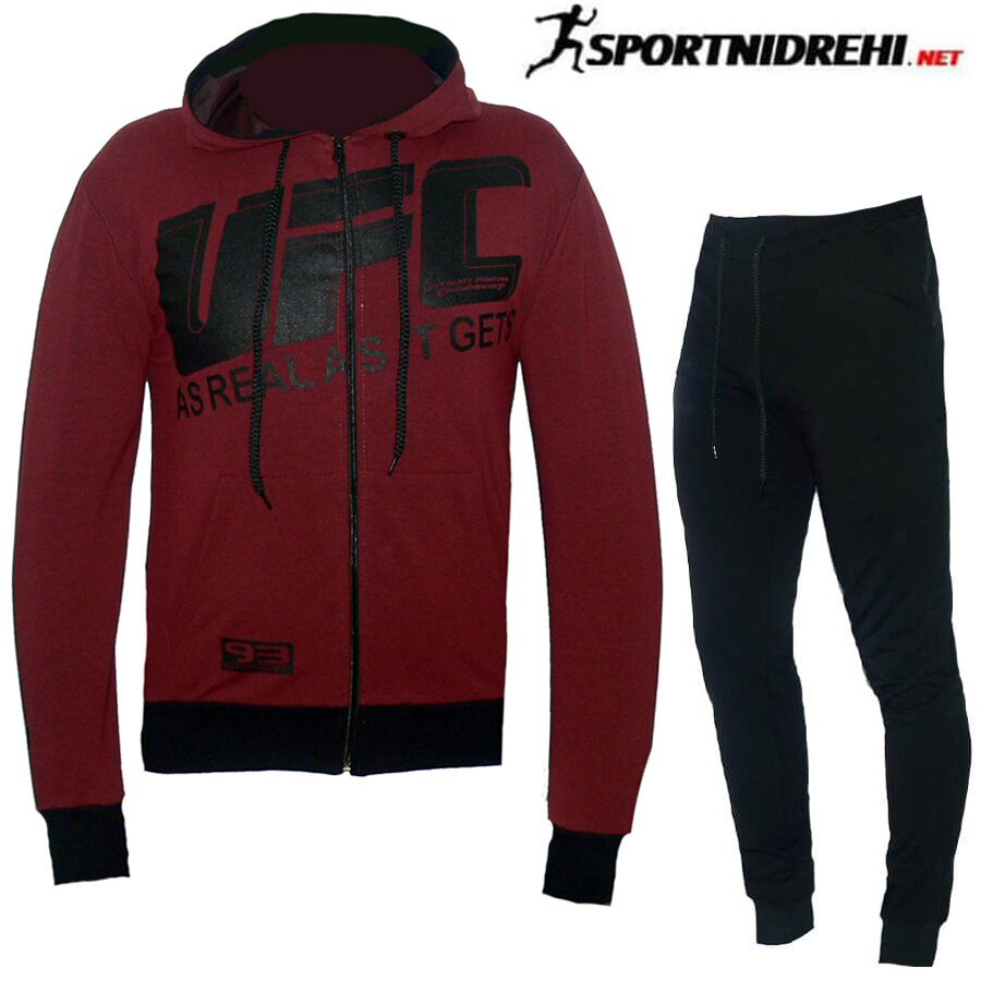 Спортен екип UFC, бордо, памук и ликра, с качулка. Анцуга е подходящ за пролетно-есенния сезон. Горнището има 2 джоба, долнището има 2 джоба отпред и 2 отзад. Долнището е стеснено долу на крачола с широк ластик. Горнището има качулка.